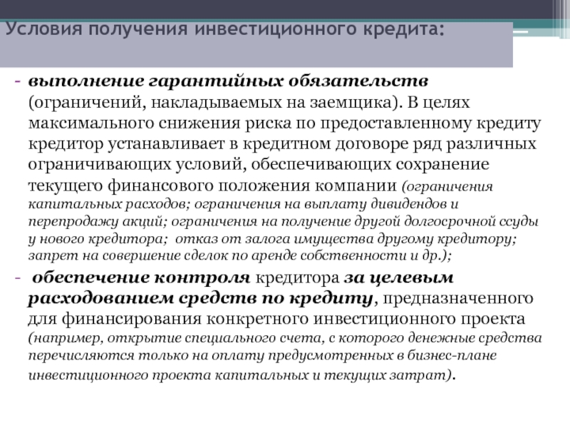 определенная потеря заемщиком независимости, если кредитор оговаривает за собой право приобретения акций компании в случае удачной реализации проекта.