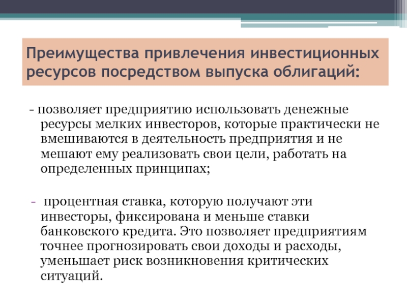 Слайд 18Преимущества привлечения инвестиционных ресурсов посредством выпуска облигаций: