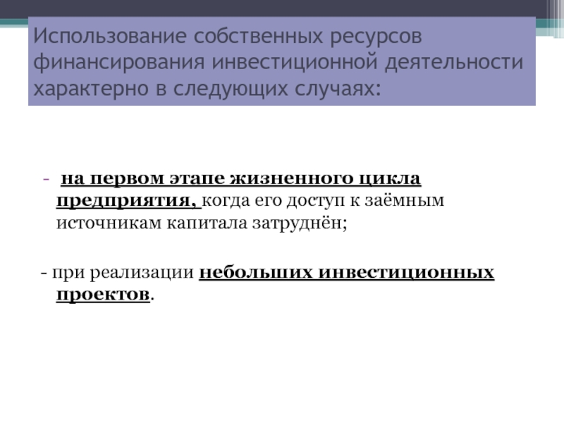 Слайд 12Использование собственных ресурсов финансирования инвестиционной деятельности характерно в следующих случаях: