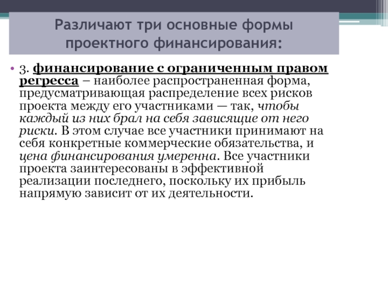 регресса – наиболее распространенная форма, предусматривающая распределение всех рисков проекта