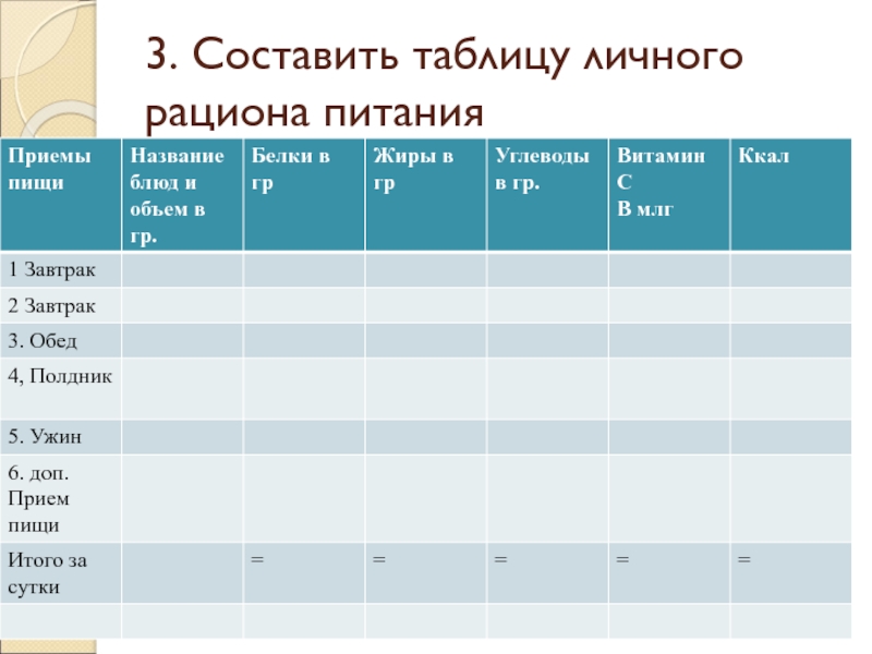 Слайд 73. Составить таблицу личного рациона питания