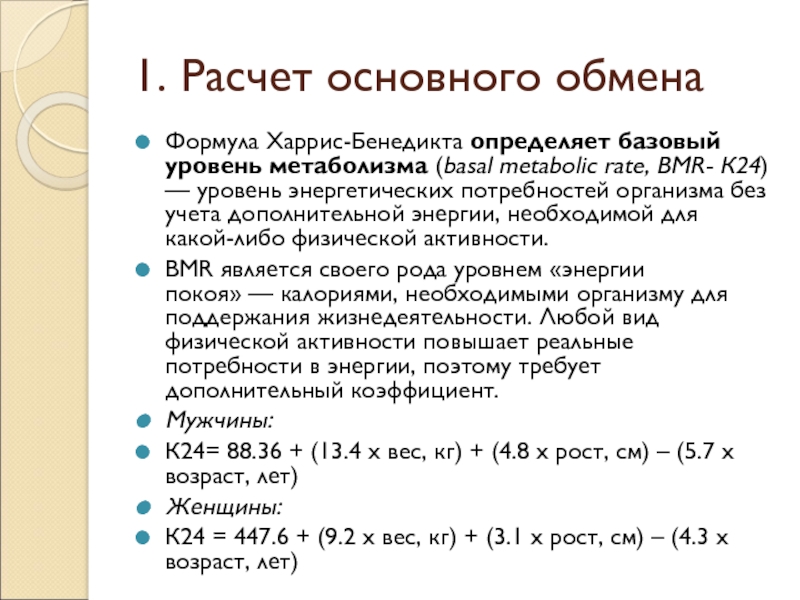 Формула Харрис-Бенедикта определяет базовый уровень метаболизма (basal