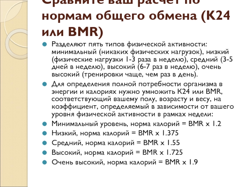 Слайд 4Сравните ваш расчет по нормам общего обмена (K24 или BMR)