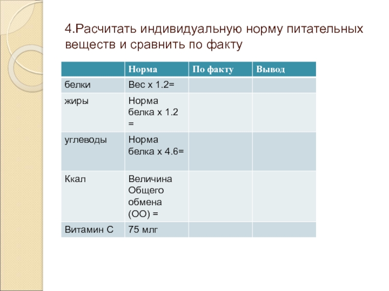 Слайд 84.Расчитать индивидуальную норму питательных веществ и сравнить по факту