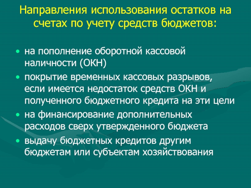 Слайд 19Направления использования остатков на счетах по учету средств бюджетов: