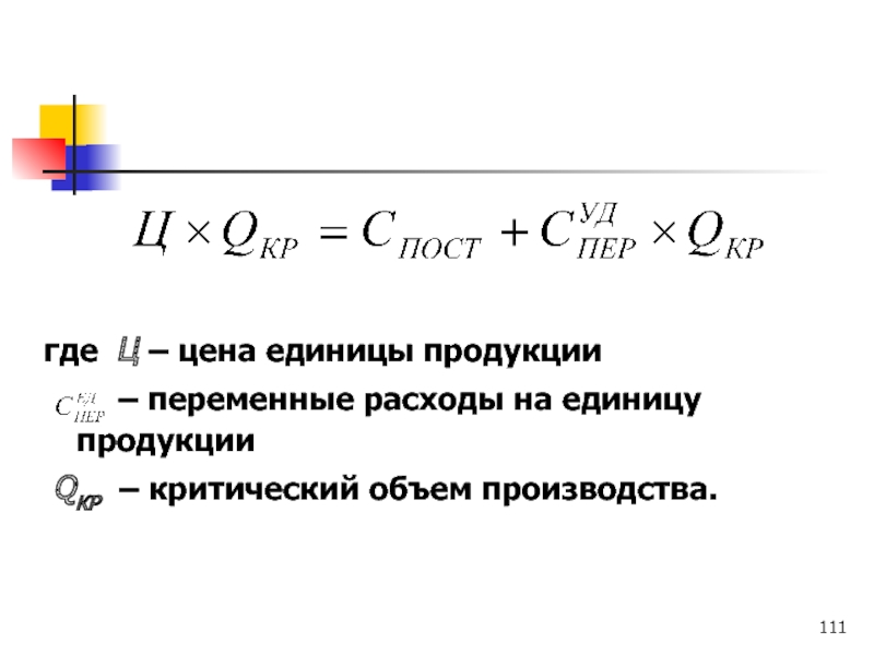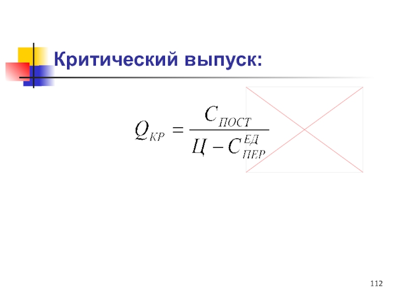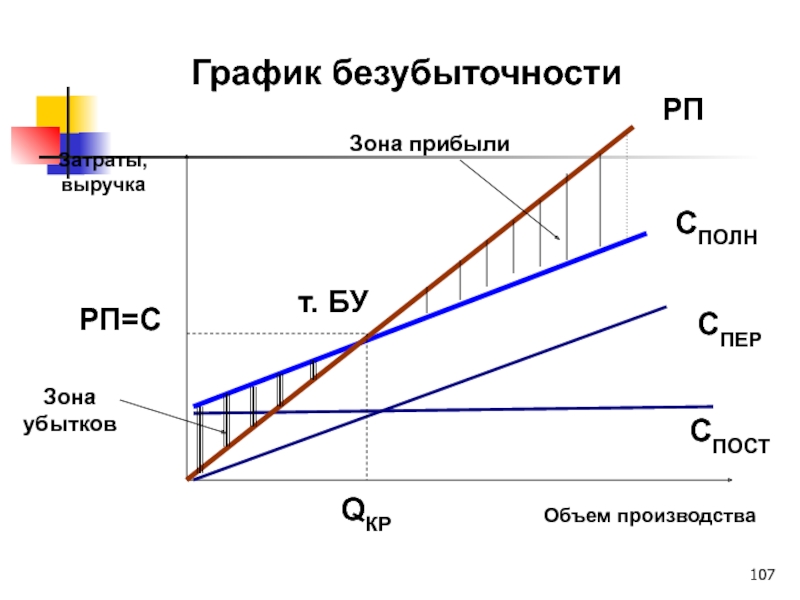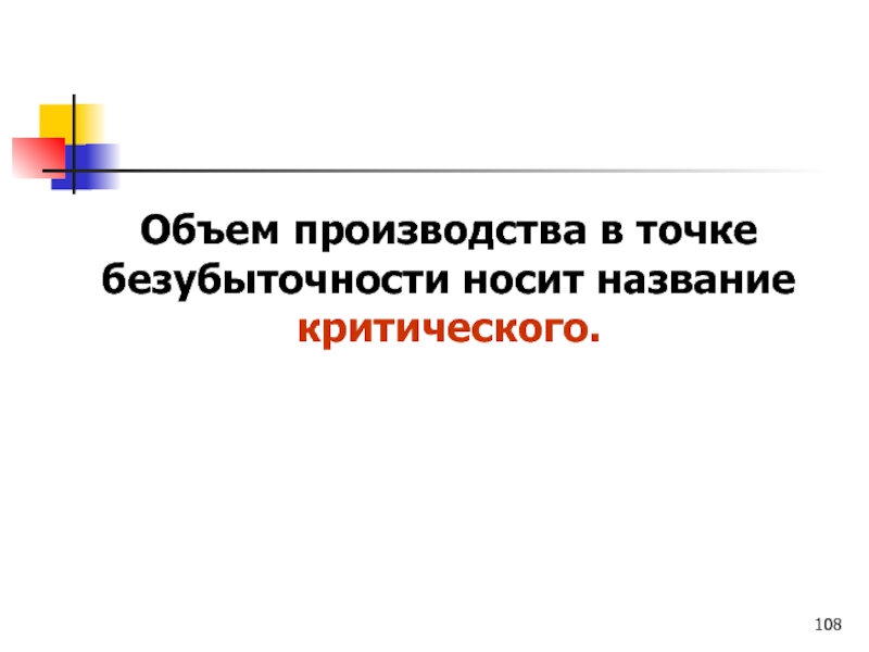 Слайд 108Объем производства в точке безубыточности носит название критического.