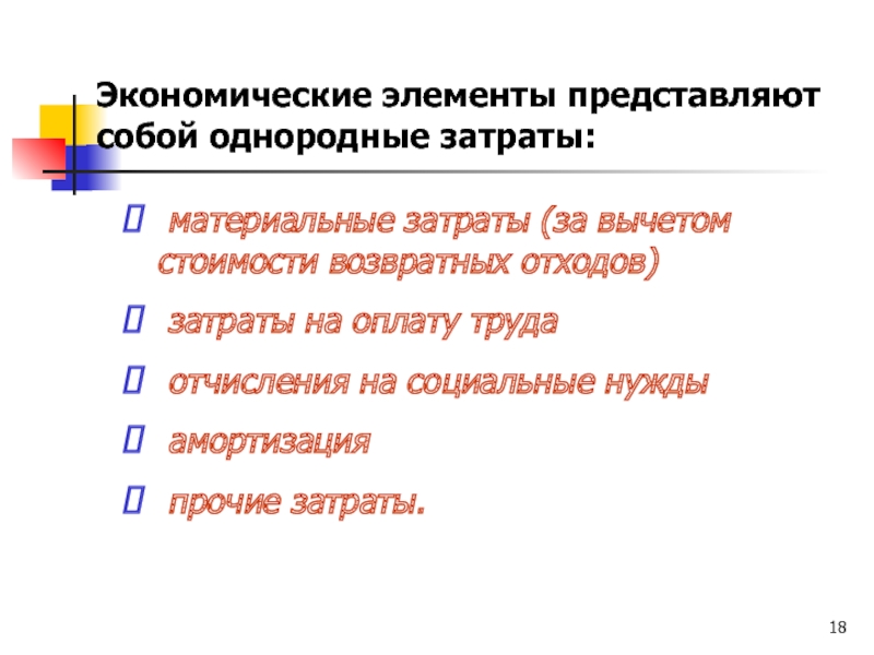 Слайд 18Экономические элементы представляют собой однородные затраты: