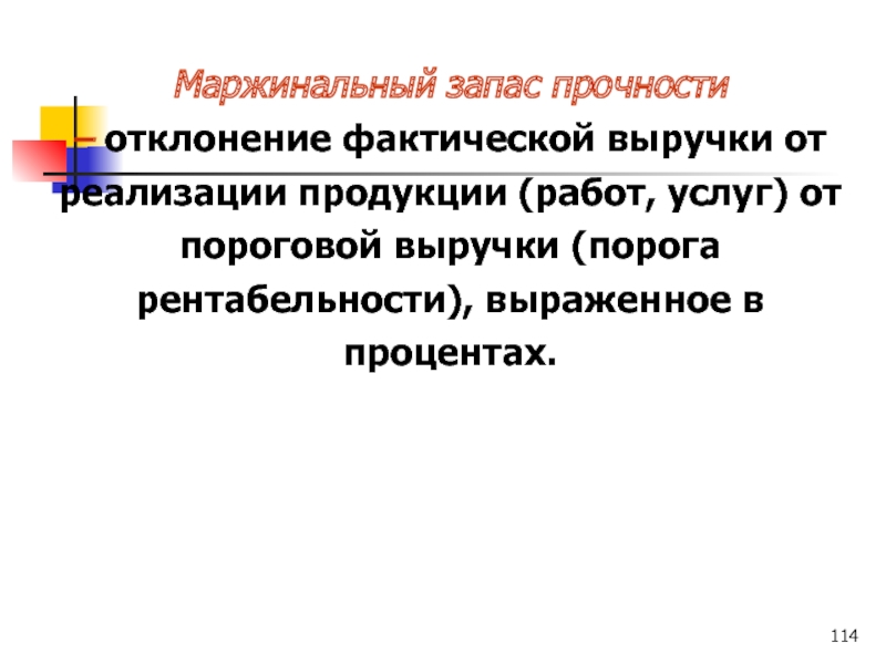 Слайд 114Маржинальный запас прочности – отклонение фактической выручки от реализации продукции (работ,
