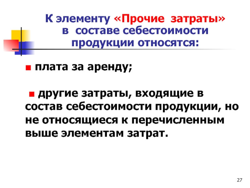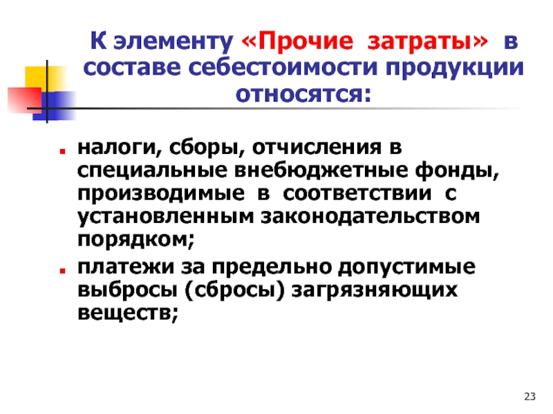 Слайд 23К элементу «Прочие затраты» в составе себестоимости продукции относятся: