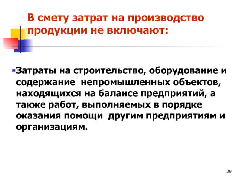 Слайд 29Затраты на строительство, оборудование и содержание непромышленных объектов, находящихся на