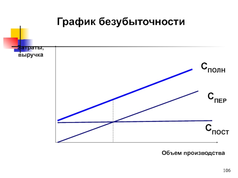 Слайд 105В основе графика безубыточности лежит деление затрат на постоянные и