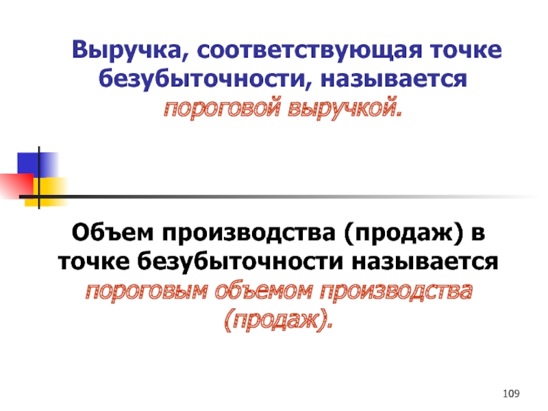 Слайд 109 Выручка, соответствующая точке безубыточности, называется пороговой выручкой.