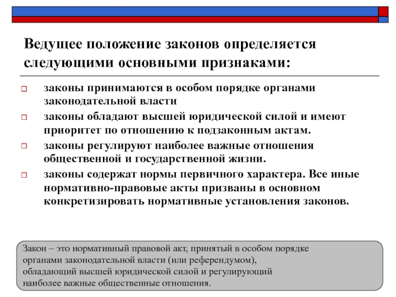 Слайд 3Ведущее положение законов определяется следующими основными признаками: