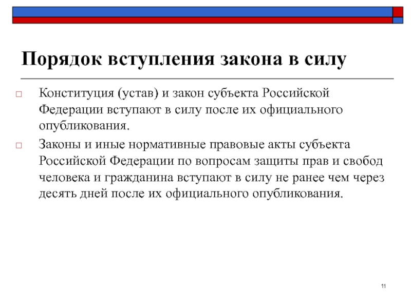 иные нормативные правовые акты субъекта Российской Федерации по вопросам защиты прав и свобод человека и гражданина вступают в силу не ранее чем через десять дней после их официального опубликования.