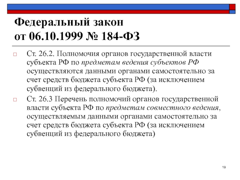 Ст. 26.3 Перечень полномочий органов государственной власти субъекта РФ по предметам совместного ведения, осуществляемым данными органами самостоятельно за счет средств бюджета субъекта РФ (за исключением субвенций из федерального бюджета)