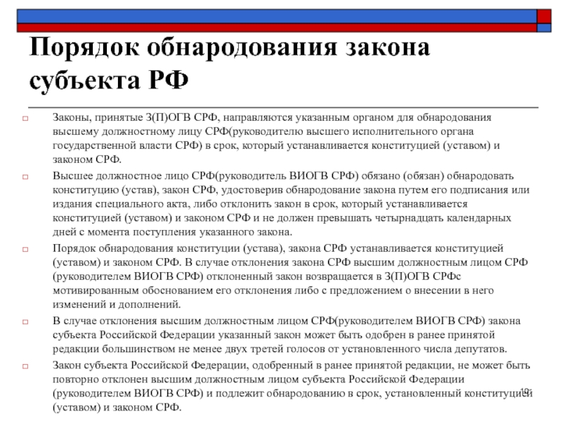 Порядок обнародования конституции (устава), закона СРФ устанавливается конституцией (уставом) и законом СРФ. В случае отклонения закона СРФ высшим должностным лицом СРФ(руководителем ВИОГВ СРФ) отклоненный закон возвращается в З(П)ОГВ СРФс мотивированным обоснованием его отклонения либо с предложением о внесении в него изменений и дополнений.