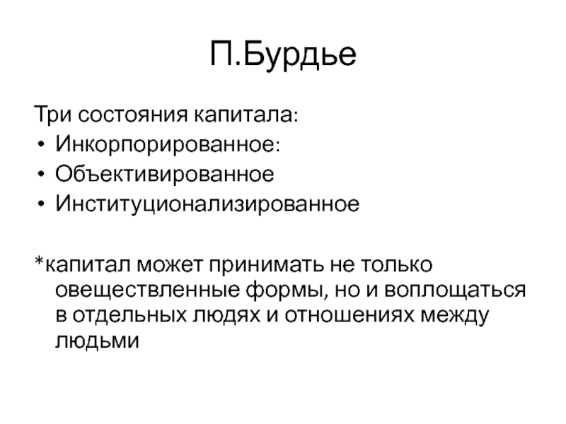 П.Бурдье Три состояния капитала:Инкорпорированное:ОбъективированноеИнституционализированное*капитал может принимать не только овеществленные формы, но и воплощаться в отдельных людях и