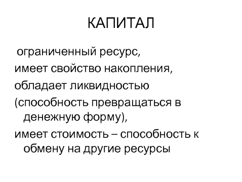 КАПИТАЛ ограниченный ресурс, имеет свойство накопления, обладает ликвидностью (способность превращаться в денежную форму), имеет стоимость – способность
