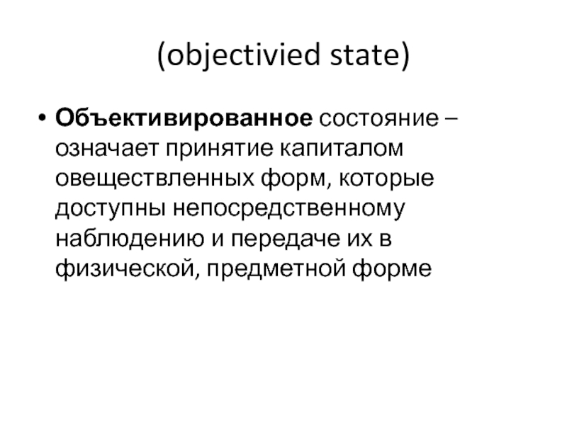 (objectivied state)Объективированное состояние – означает принятие капиталом овеществленных форм, которые доступны непосредственному наблюдению и передаче их в