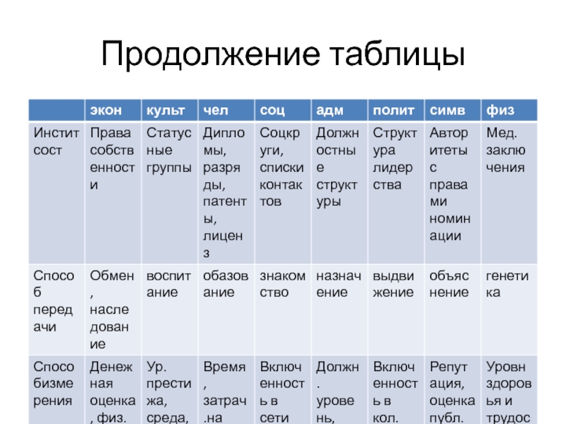 экономический, физический, культурный, человеческий, социальный, административный, политический, символический.