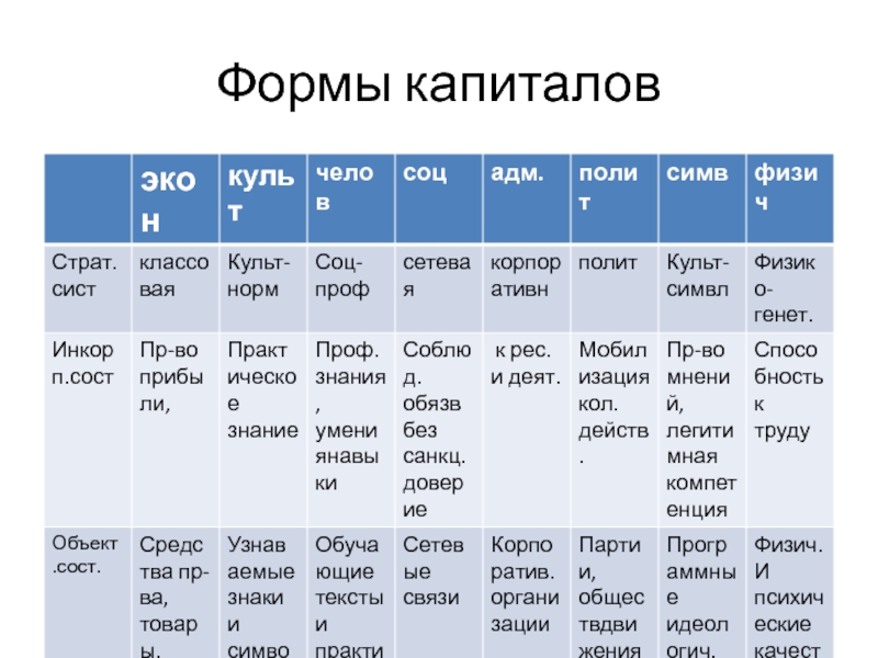 ФОРМЫ КАПИТАЛОВэкономический, физический, культурный, человеческий, социальный, административный, политический, символический.Различия в способах передачи форм капитала между хозяйственными агентами