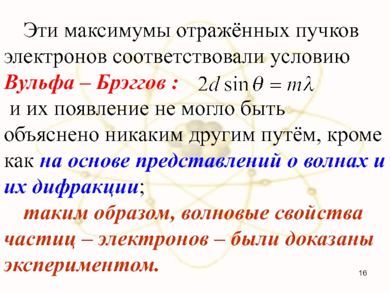 Слайд 16 Эти максимумы отражённых пучков электронов соответствовали условию Вульфа – Брэггов