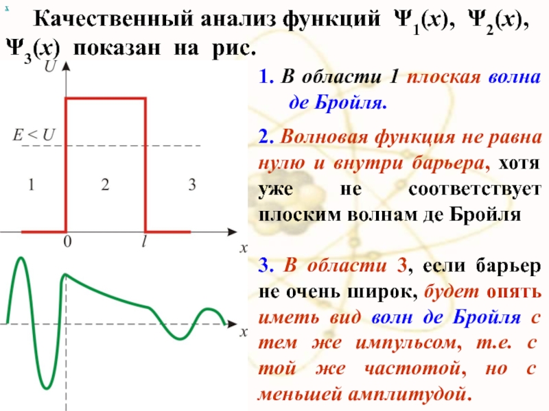 3. В области 3, если барьер не очень широк, будет опять иметь вид волн де Бройля с тем же импульсом, т.е. с той же частотой, но с меньшей амплитудой.