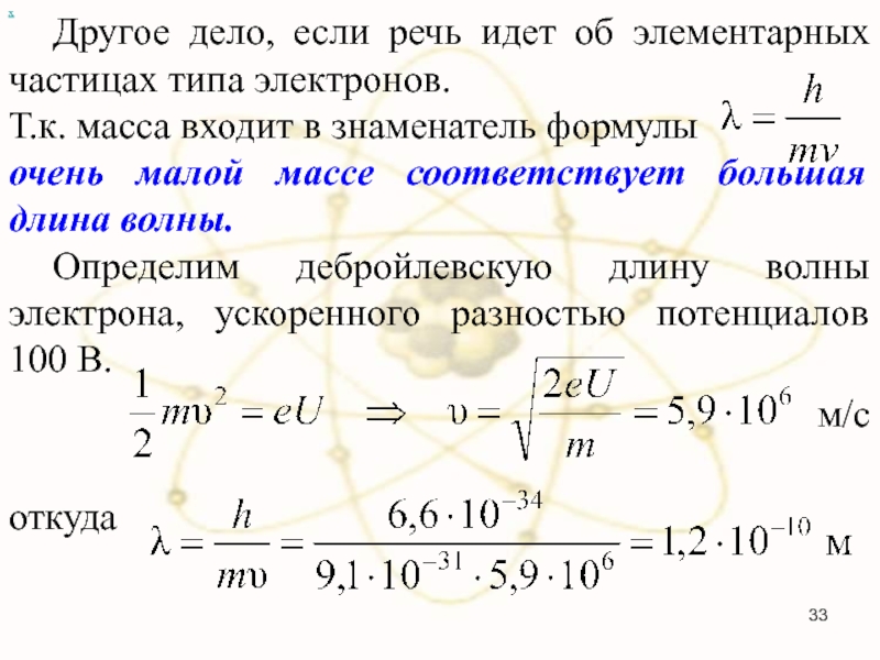 Поскольку кинетическая энергия сравнительно медленно движущейся частицы , то длину волны можно выразить через энергию:
