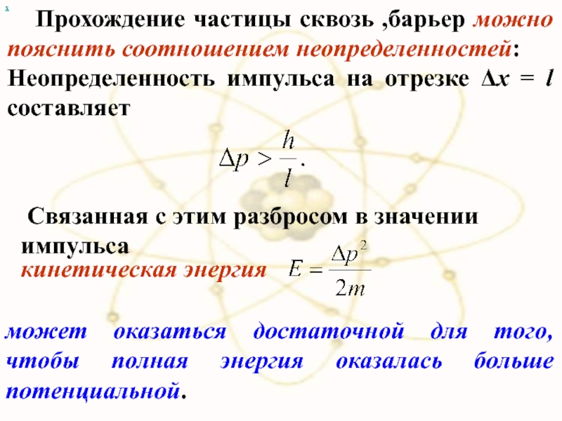Прохождение частицы сквозь ,барьер можно пояснить соотношением неопределенностей: Неопределенность импульса