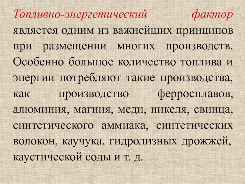 Слайд 25Топливно-энергетический фактор является одним из важнейших принципов при размещении многих