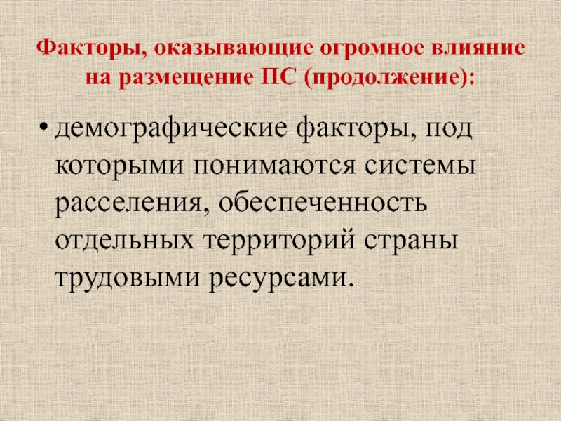 Слайд 31Факторы, оказывающие огромное влияние на размещение ПС (продолжение):