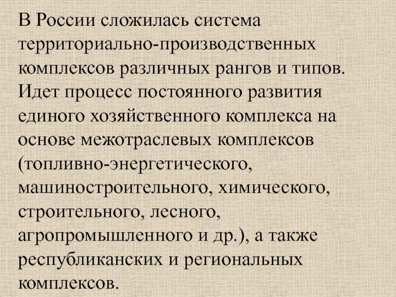 Слайд 13В России сложилась система территориально-производственных комплексов различных рангов и типов.