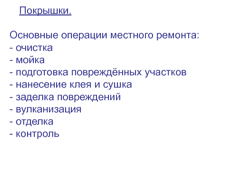 Слайд 3 Покрышки. Основные операции местного ремонта: - очистка - мойка - подготовка