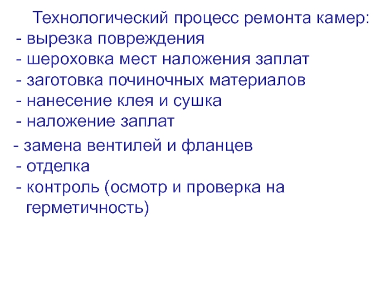 Технологический процесс ремонта камер: - вырезка повреждения - шероховка мест наложения заплат - заготовка