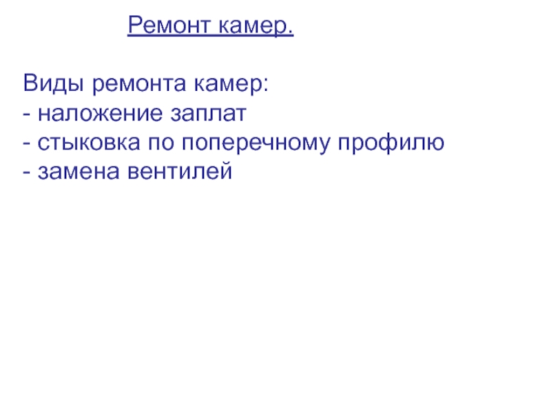 камер. Виды ремонта камер: - наложение заплат - стыковка по поперечному профилю - замена