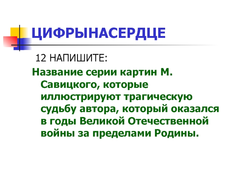 ЦИФРЫНАСЕРДЦЕ 12 НАПИШИТЕ:Название серии картин М.Савицкого, которые иллюстрируют трагическую судьбу автора, который оказался в годы Великой Отечественной