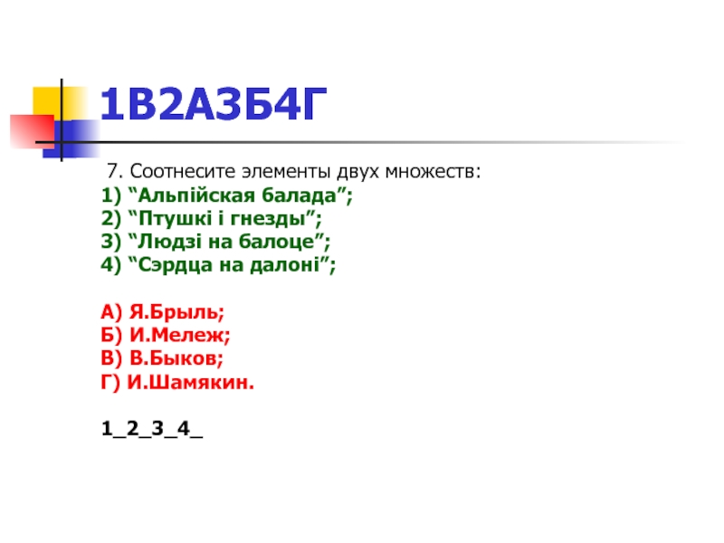 1В2А3Б4Г 7. Соотнесите элементы двух множеств:1) “Альпійская балада”;2) “Птушкі і гнезды”;3) “Людзі на балоце”;4) “Сэрдца на далоні”;А)