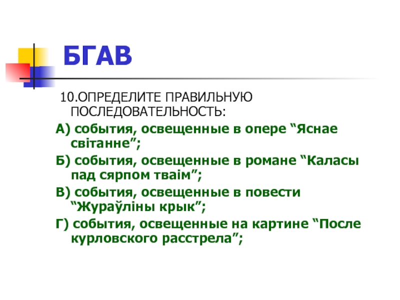 БГАВ 10.ОПРЕДЕЛИТЕ ПРАВИЛЬНУЮ ПОСЛЕДОВАТЕЛЬНОСТЬ:А) события, освещенные в опере “Яснае світанне”;Б) события, освещенные в романе “Каласы пад