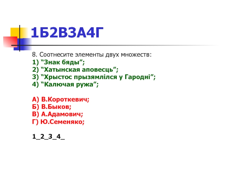 1Б2В3А4Г8. Соотнесите элементы двух множеств:1) “Знак бяды”;2) “Хатынская аповесць”;3) “Хрыстос прызямлілся у Гародні”;4) “Калючая ружа”;А) В.Короткевич;Б) В.Быков;В)