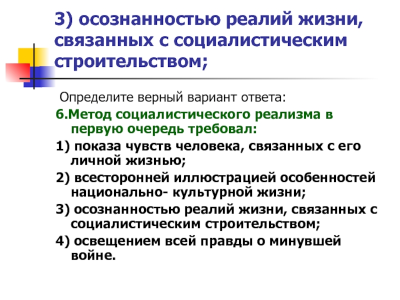 3) осознанностью реалий жизни, связанных с социалистическим строительством; Определите верный вариант ответа:6.Метод социалистического реализма в первую очередь
