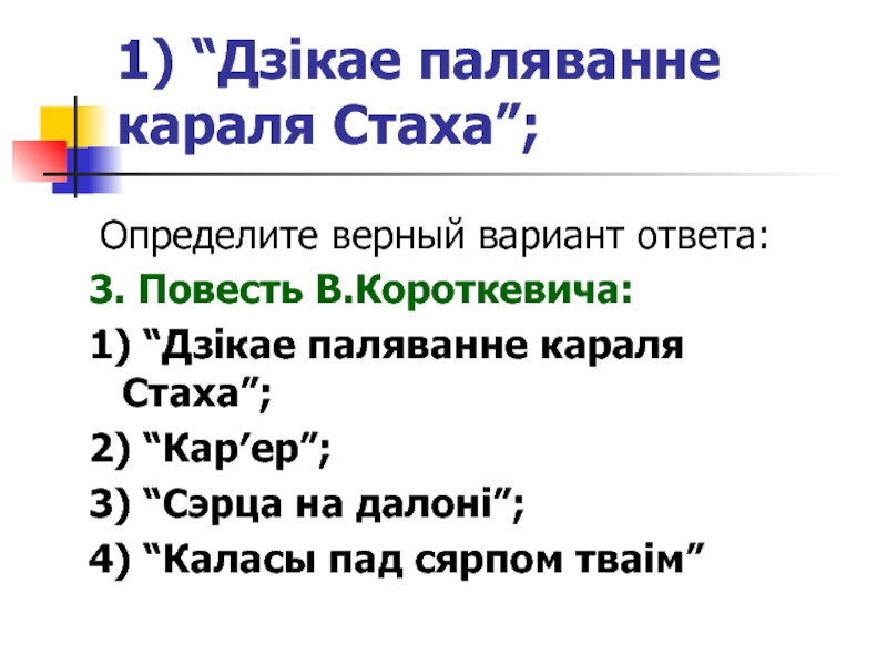 1) “Дзікае паляванне караля Стаха”; Определите верный вариант ответа:3. Повесть В.Короткевича:1) “Дзікае паляванне караля Стаха”;2) “Кар′ер”;3) “Сэрца