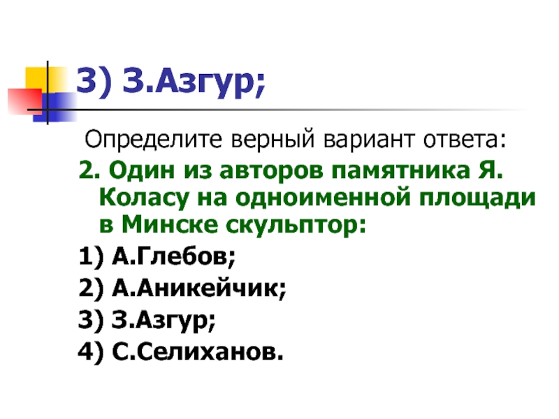 3) З.Азгур; Определите верный вариант ответа:2. Один из авторов памятника Я.Коласу на одноименной площади в Минске скульптор:1)