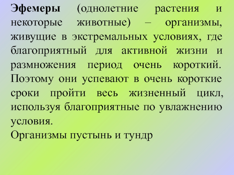 Слайд 28Эфемеры (однолетние растения и некоторые животные) – организмы, живущие в