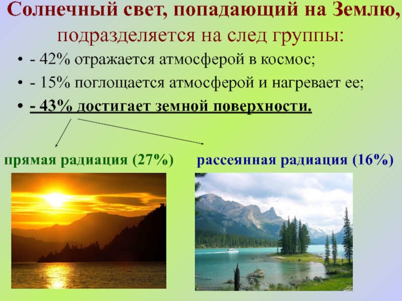 Слайд 6Солнечный свет, попадающий на Землю, подразделяется на след группы: