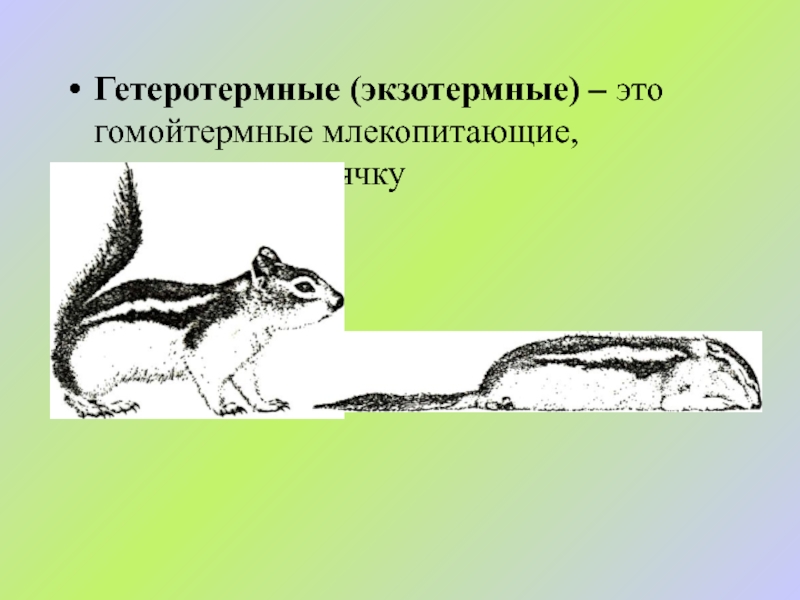 Слайд 13Гетеротермные (экзотермные) – это гомойтермные млекопитающие, впадающие в спячку