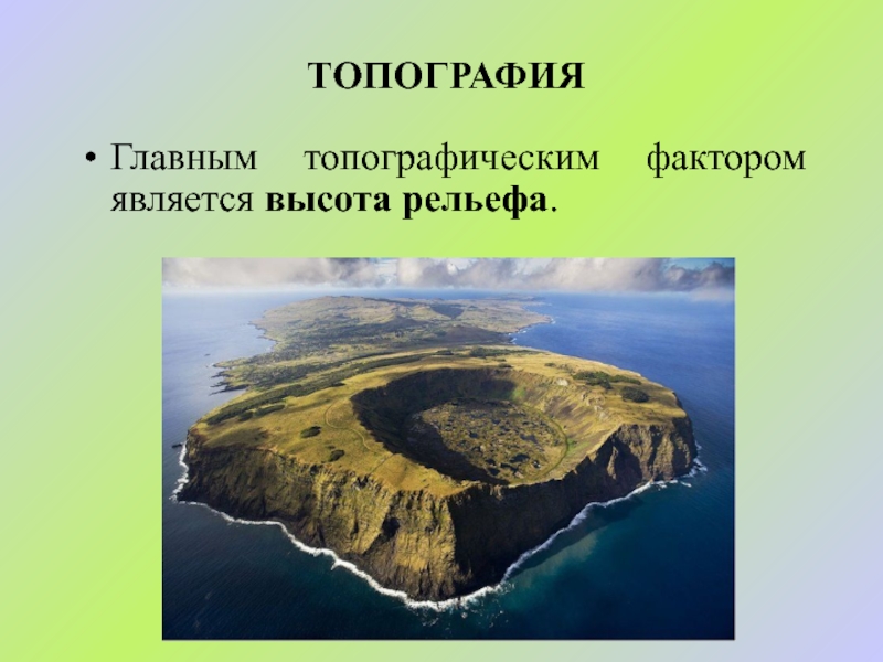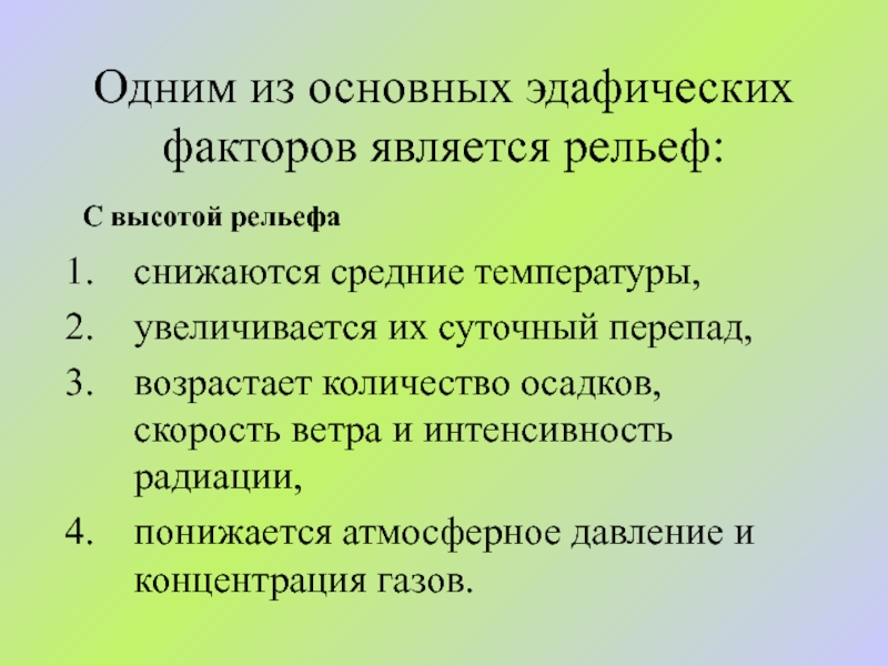 Слайд 33Одним из основных эдафических факторов является рельеф:
