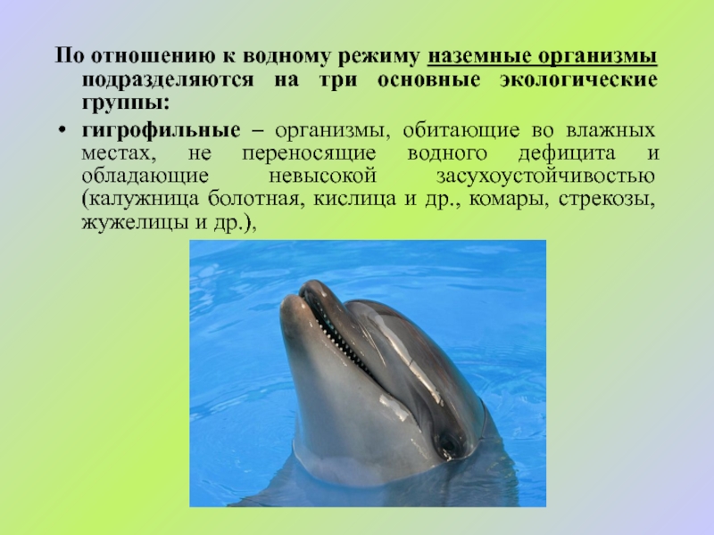Слайд 25По отношению к водному режиму наземные организмы подразделяются на три