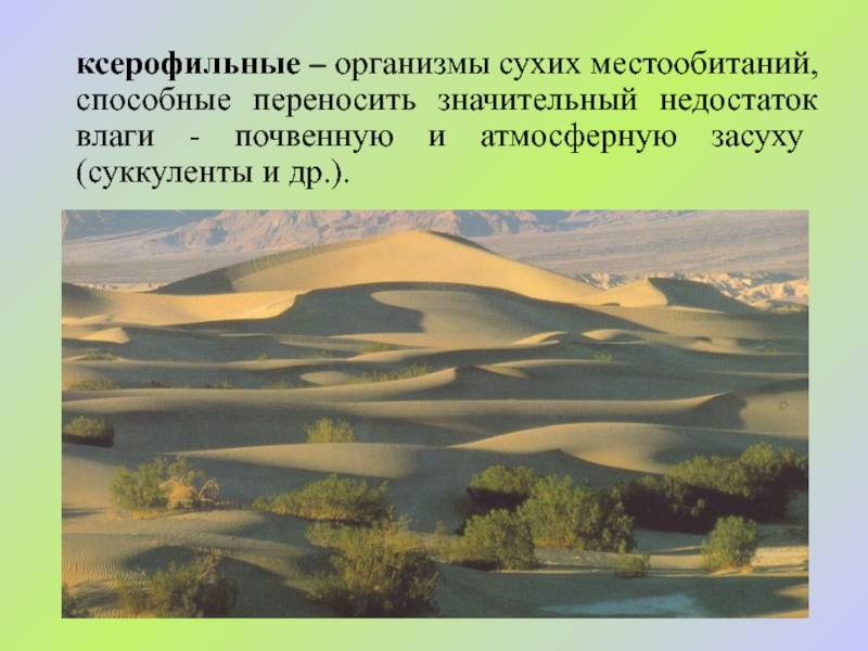 Слайд 27ксерофильные – организмы сухих местообитаний, способные переносить значительный недостаток влаги