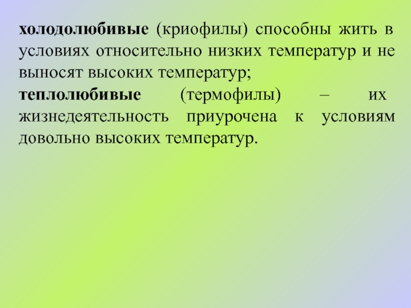 Слайд 17холодолюбивые (криофилы) способны жить в условиях относительно низких температур и
