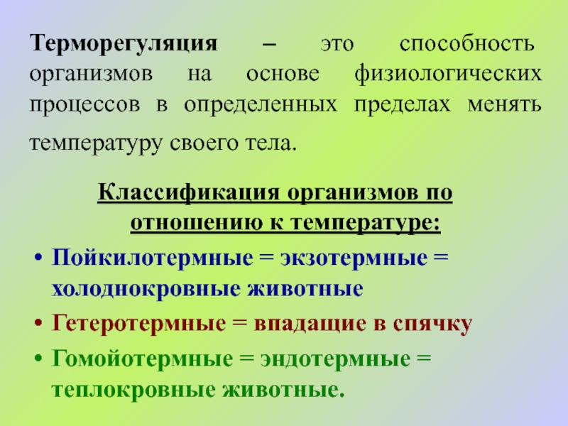 Слайд 11Терморегуляция – это способность организмов на основе физиологических процессов в